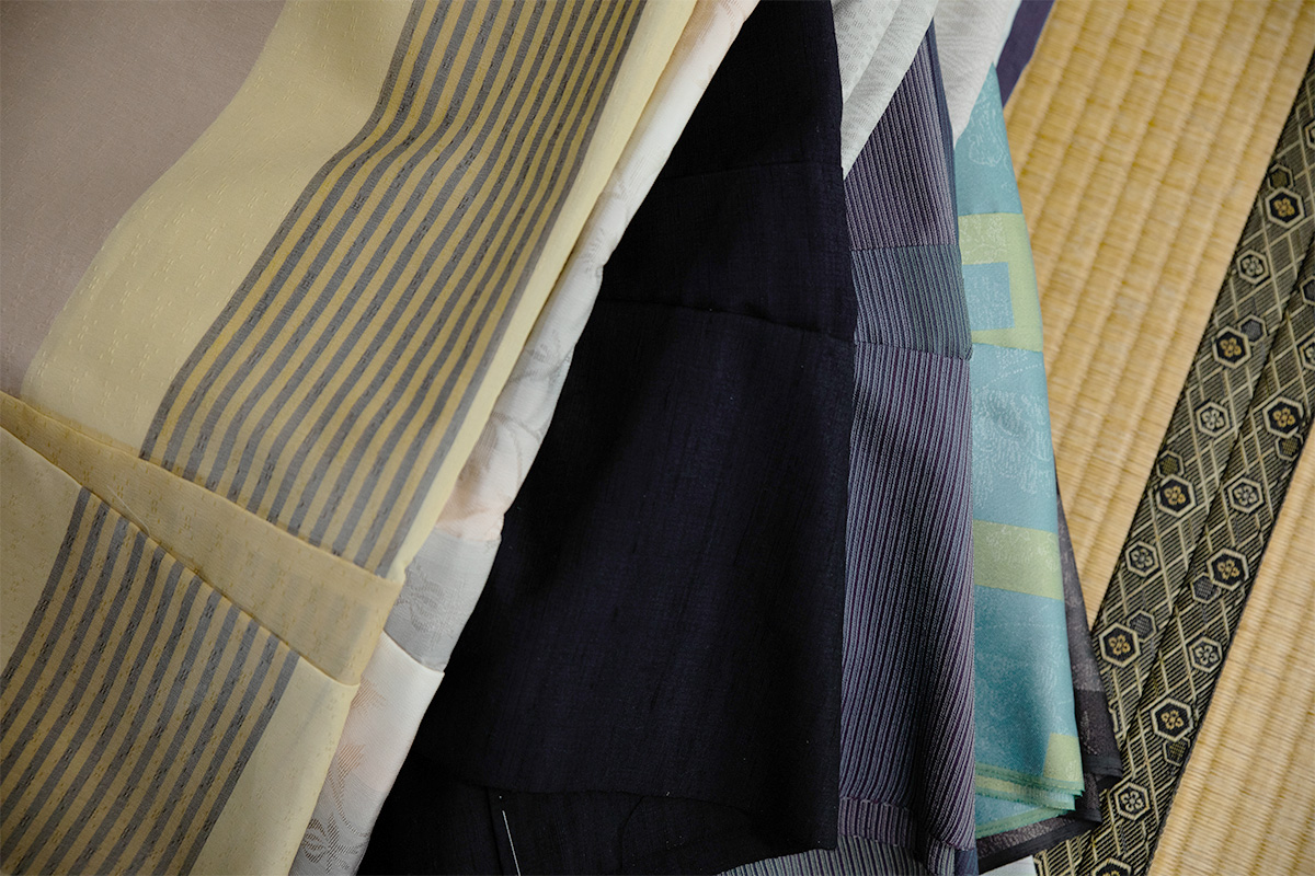 最近は特に年中暑い。いわゆる一重の夏物の着物は6月から9月に着るものとされています。もじり織や透絢にしても、着ていてまとわりつかないというか、さらりとした着心地です。袷の着物として5月から10月、あるいは4月や11月の不意に暑くなった日にも快適に着ていただける生地になっています。着心地は糸の品質に大きく左右されます。だからこそ使用する糸の品質については妥協せず、着る人が心地よく過ごせるように、最高のものを追求していきたいですね。」