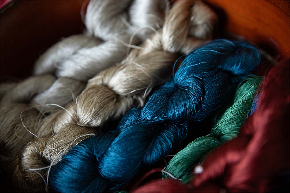 豪一さんは工房で染めたさまざまな糸を見せてくれた。中でも米沢らしい、珍しいと言って目を引いたのが、艶のある灰色をした糸。